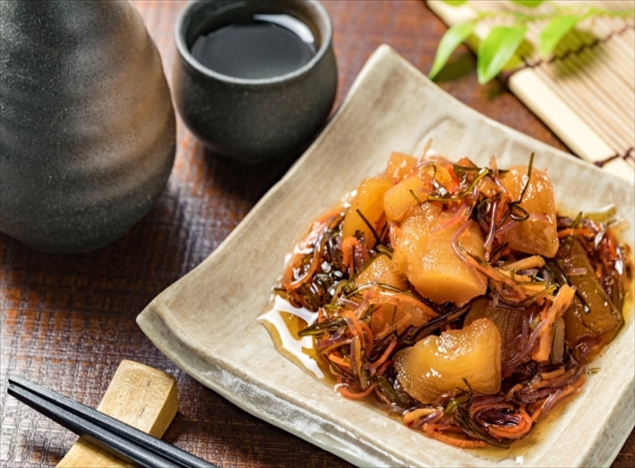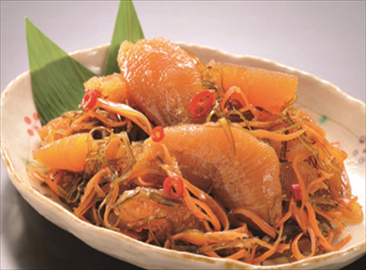 真昆布とスルメを使用し、数の子をふんだんに加えた贅沢な松前漬です。 数の子の歯ざわりとスルメの旨味、良質な昆布の味わいは、まさに 珍味の王様です。